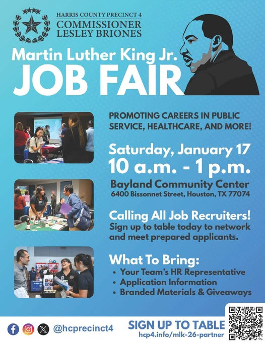HCSO is excited to participate in the MLK Job Fair, hosted by the Office of Commissioner Lesley Briones, Precinct 4. Stop by to meet our team, ask questions, and learn about career opportunities in law enforcement and public service.
