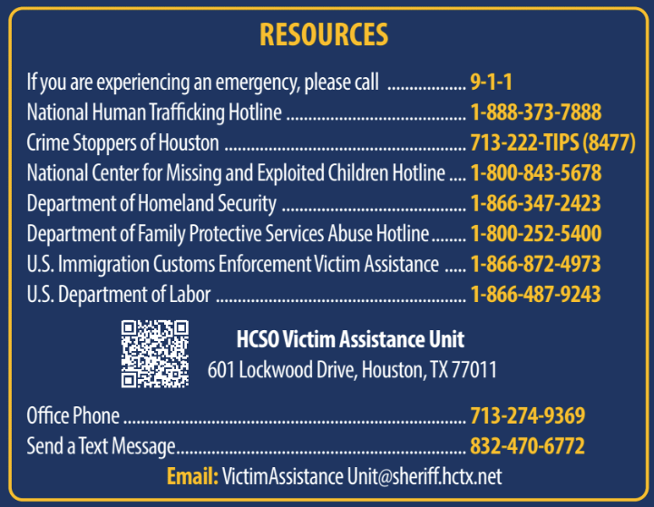 HCSO remains committed to protecting the most vulnerable members of our community and ensuring traffickers are held accountable. If you or someone you know needs help, call 1-888-373-7888 or text 233733. Through continued enforcement, partnerships, education, and compassion, the agency works year-round to combat human trafficking and support survivors on their path forward.