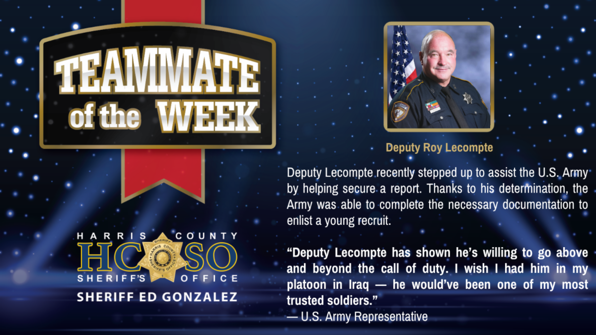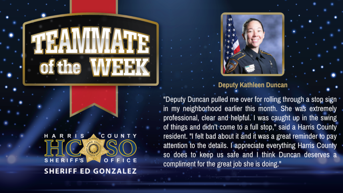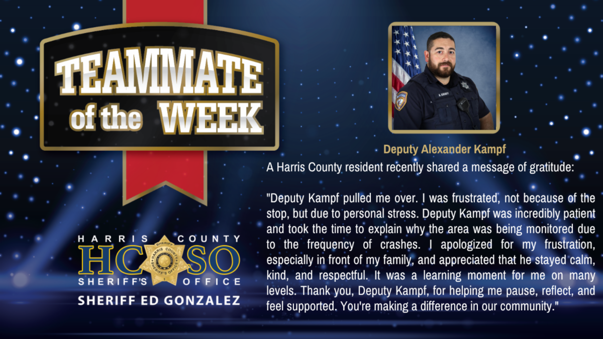 Harris County Sheriff’s Office Teammate of the Week: Sheriff Ed Gonzalez and the HCSO highlight exceptional teammates who serve others above and beyond their duties. We regularly receive positive emails, thank you notes, and phone calls from the community.