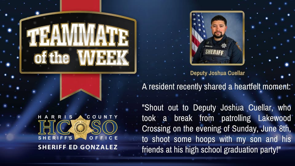 Sheriff Ed Gonzalez and the Harris County Sheriff’s Office proudly recognize Deputy Joshua Cuellar as our Teammate of the Week. His dedication, professionalism, and connection with the community exemplify the best of public service.