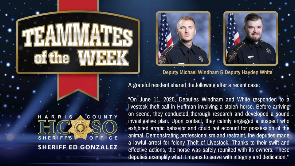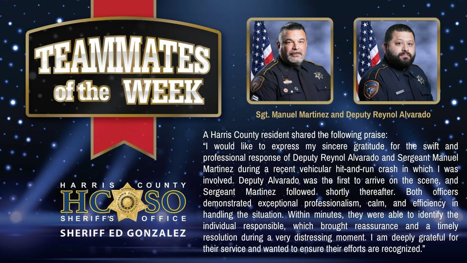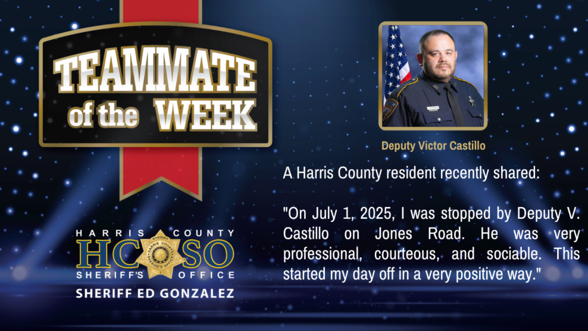 Sheriff Ed Gonzalez and the Harris County Sheriff’s Office proudly recognize Deputy Victor Castillo as our Teammate of the Week. With 16 years of distinguished service, Deputy Castillo continues to exemplify professionalism, courtesy, and an unwavering commitment to the people of Harris County.