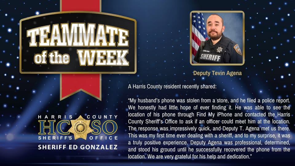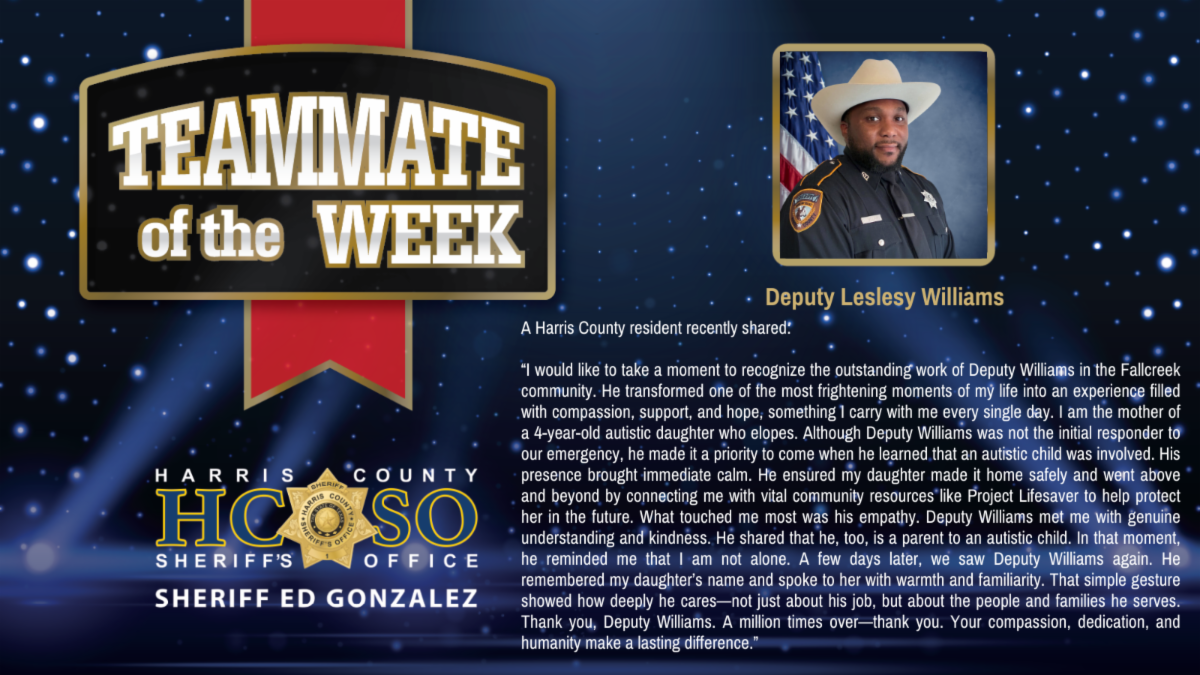 Harris County Sheriff’s Office Teammate of the Week: Sheriff Ed Gonzalez and the HCSO highlight exceptional teammates who serve others above and beyond their duties. We regularly receive positive emails, thank you notes, and phone calls from the community.