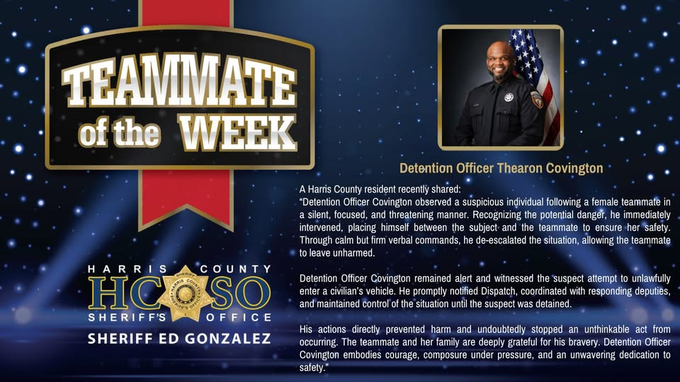 Sheriff Ed Gonzalez and the Harris County Sheriff’s Office proudly recognize Armed Detention Officer Thearon Covington as our Teammate of the Week.